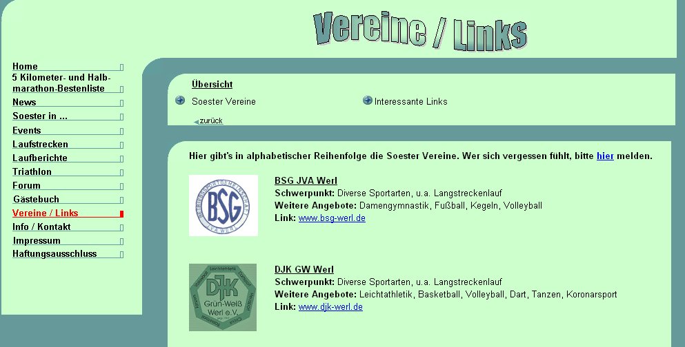 Längst überfällig war die Umstellung auf das neue Design im Menüpunkt 'Vereine / Links'. Neu hinzugenommen habe ich die Seite des LAZ Soest, sowie das Lippstädter Laufprojekt 'Wir schaffens 42'. Das Team-Powerfood aus Welver scheint wohl nicht mehr zu existieren, daher habe ich den Verweis auf diese Seite rausgenommen (sorry Forest ;-).