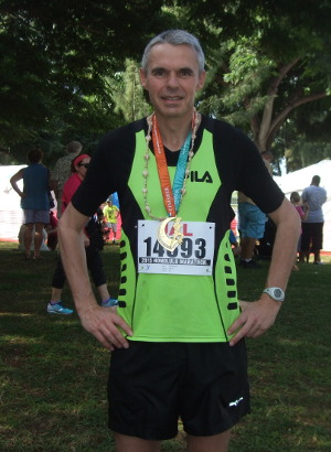 Nach dem Sonnenaufgang wurde es heißer und heißer, Kalte Duschen und Schwämme auf der Strecke brachten etwas Abkühlung. Kommentar: „Dies war kein normaler Marathon. Nach dem Sonnenaufgang hatte ich das Gefühl, ich laufe mit Sportbekleidung in der Sauna. Die letzten 2 km waren allerdings flach, so dass ich das Ziel im Kapiolani Park dennoch glücklich erreichte.“