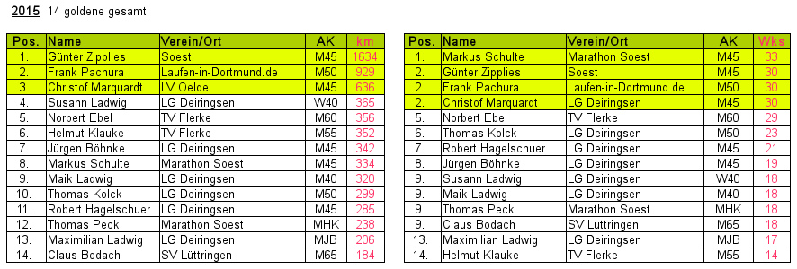 ) erlaufen sich diejenigen, die mindestens 300 Wettkampfkilometer oder 15 Wettkampfteilnahmen vorweisen können. In 2015 waren es insgesamt 13 Männer und eine Frau, also nur einer weniger als im Jahr davor. Und diejenigen, die besonders aktiv waren, erhalten an dieser Stelle (virtuelle) Medaillen in Gold, Silber und Bronze, jeweils in den Kategorien Kilometer- und Wettkampfsammler.
