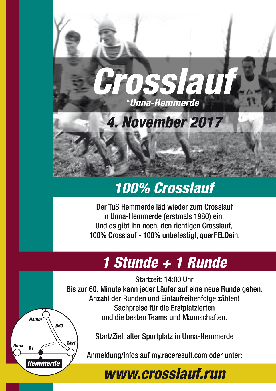 Wir werden unseren Crosslauf am 4.11.2017 wieder aufleben, allerdings in der Form eines "Ein- Stunden-Crosslauf + Ende der letzten angefangenen Runde". Für die Einzel- wie auch Teamwertung zählt die Zahl der zurückgelegten Runden.
