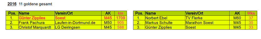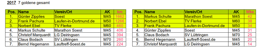 Kilometersammler: Günter hat seinen goldenen Hattrick zusammen. Nach 2015 und 2016 markierte er auch im vergangenen Jahr die Spitzenposition mit insgesamt 1.662 Kilometern. Ihm fehlte "nur" ein Marathon, um seinen Rekord aus 2016 zu eleminieren. Wo wir schon beim Hattrick sind: den silbernen "Dreier" schaffte Frank mit knapp 400 Kilometern Rückstand auf Günter. Erstmalig auf dem Treppchen bei den Kilometersammlern steht Norbert, der mit der Bronzemedaille dekoriert wird.